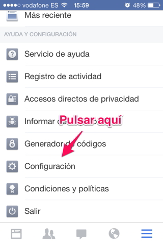 Cuando pulsemos en estas pequeñas barras, entraremos en el menú de nuestra cuenta de Facebook. Tan solo debemos desplazarnos hacia abajo, hasta que encontremos la pestaña de «Configuración».
