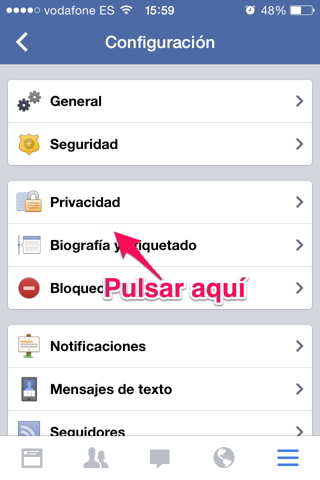 Dentro de configuración, debemos seleccionar la pestaña de «Privacidad», donde entraremos a una nueva pantalla, para configurar nuestras publicaciones, es decir, el acceso restringido en Facebook.