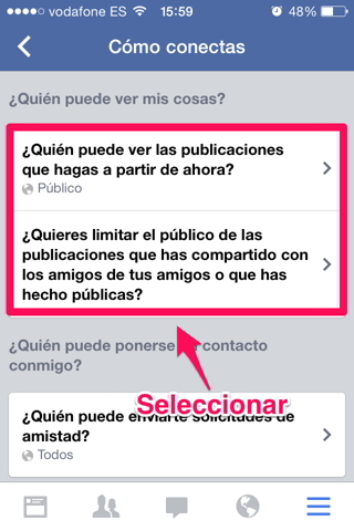 En este nuevo menú, debemos centrarnos en el primer apartado, «¿Quién puede ver mis cosas?». Como vemos, tenemos 2 opciones, y que debemos configurar según nuestras necesidades.