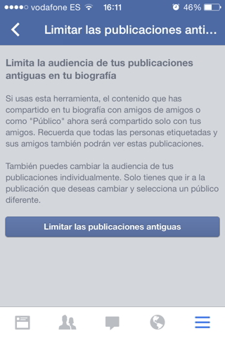 - Limitar las publicaciones que ya has realizado. En esta opción, limitaremos las publicaciones que hayamos hecho, es decir, que aunque ya estén publicadas, también podemos restringirlas. Si pulsamos sobre esta opción, nos aparecerá un mensaje en el que nos indica lo que vamos a hacer (restringir publicaciones pasadas). Pulsamos en la barra azul que nos aparece y elegimos al publico que queremos que lea nuestras publicaciones.