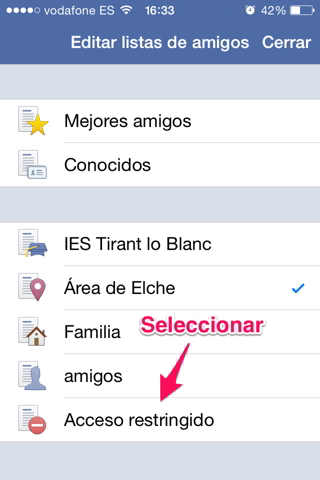 Automáticamente, nos aparecerá una lista en la que tenemos que seleccionar, según nuestra preferencia. Si elegimos «Acceso restringido», tan solo verá aquello que queramos. Como lo que queremos es crear un acceso restringido en Facebook, pulsamos esta opción.