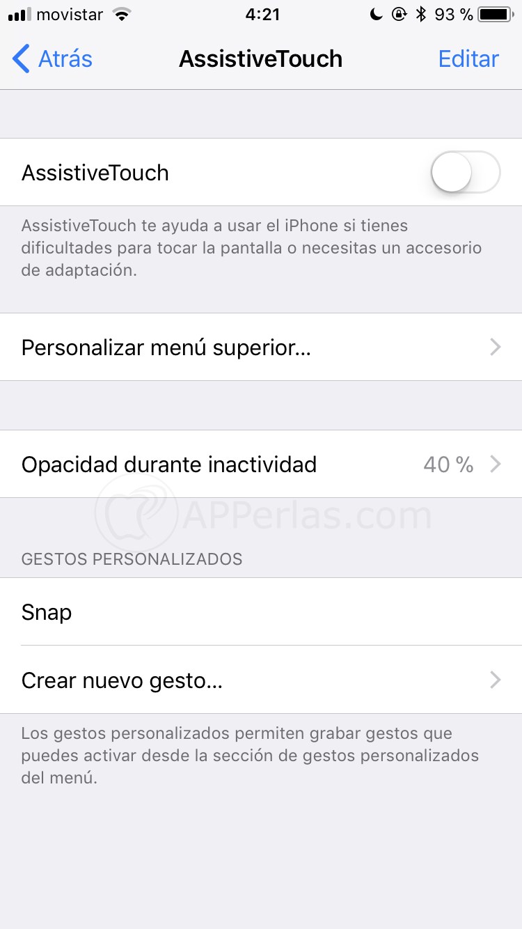 Si no os funciona ninguna de las tres primeras opciones siempre queda la cuarta manera. Con ella supliremos el botón HOME por uno virtual. Para ello habilitaremos el Assistive Touch que es una especie de botón HOME virtual, que nos aparecerá en la pantalla del dispositivo. Para activarlo entramos en AJUSTES/GENERAL/ACCESIBILIDAD/ASSISTIVE TOUCH y activamos la opción.