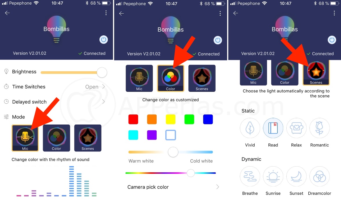 1. MIC: Permite que mediante el sonido, la bombilla led de colores vaya cambiado de tonalidad. Es un buen modo, sobre todo, en fiestas. Al ritmo de la música la luz cambiará de color.