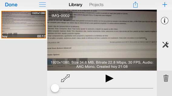 - En el editor completo, podremos añadir vídeos desde la biblioteca de fotos o grabarlos con la aplicación. Estos serán vinculados y no se duplicarán en tu dispositivo.