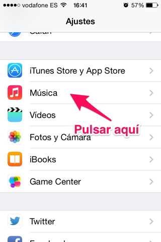 Debemos pulsar en este icono. Una vez dentro, accederemos a todos los ajustes posibles en esta aplicación. Donde podremos configurar como queremos que aparezcan los artistas, suscribirnos a iTunes Match… Y donde también tendremos la opción de «Agitar para aleatorio».