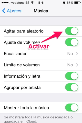 Al activar esta opción y agitar nuestro iPhone, no pasamos a la siguiente canción, sino que activamos el modo aleatorio.