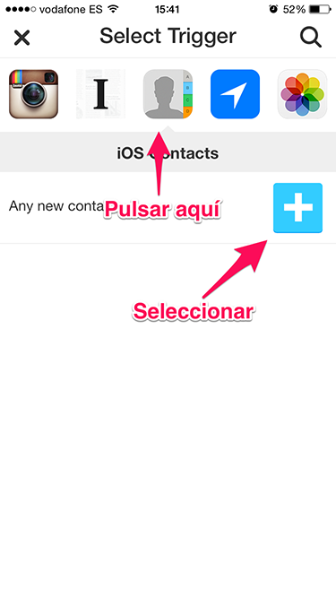 Para crear un nueva, debemos pulsar sobre el icono del mortero que nos aparece en la parte de arriba a la derecha. Automáticamente nos aparecerá la famosa frase «If + then +». Tendremos que pulsar sobre el primer símbolo «+» y elegir la aplicación deseada. En este caso, es la de contactos de iOS.