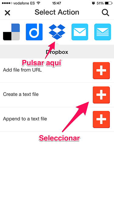 Al seleccionar esta aplicación, tendremos que seleccionar la opción «Create a text file». Que es la opción para crear un documento de texto de nuestros contactos en dropbox.