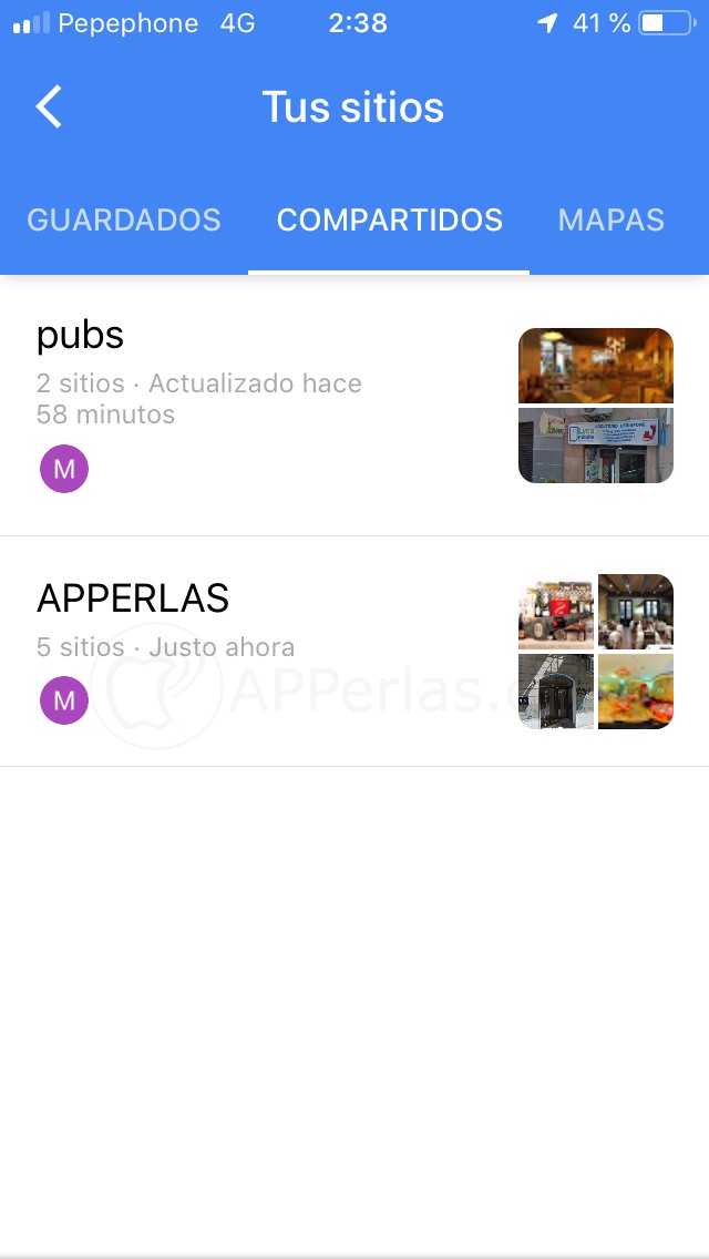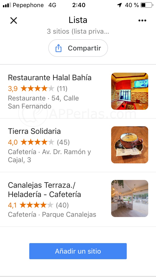 Las listas compartidas aparecerán dentro del menú «Tus Sitios». Este lo podrás encontrar en el menú lateral de la aplicación, al que se accede pulsando en las 3 rayitas horizontales que nos aparecen en la parte superior izquierda de la pantalla.