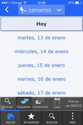 En la parte de arriba de la pantalla, vemos dos botones con los que podremos filtrar la información por días o por deportes: