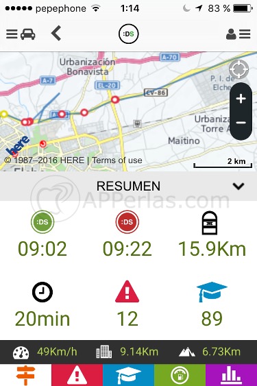 Todo la ruta que realicemos queda registrada en la aplicación y a partir de ella y de nuestra manera de conducir, nos aparecerán los indicadores que nos dirán que tal conducimos valorando aspectos como la velocidad, giros bruscos, aceleraciones bruscas, frenazos… y, además, nos dirá el rendimiento de nuestro trayecto valorando la eficiencia de nuestra conducción.
