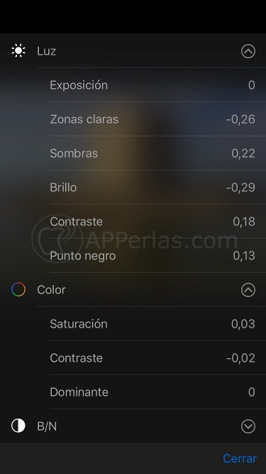 - DE MANERA RÁPIDA: De las tres opciones que nos aparecen en la parte inferior de la pantalla, seleccionamos la que se caracteriza con un circulo rodeado de puntitos. Una vez dentro del menú pulsaremos en los nombres de cada una de las tres opciones que vemos (Luz, Color y B/N) y desplazaremos a derecha o izquierda el selector que nos aparecerá, para conseguir el efecto que deseamos.