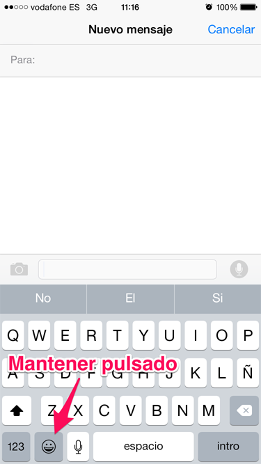 Por lo tanto nos dirigimos a cualquier app, en nuestro caso iMessage y desplegamos el teclado. Una vez lo tenemos desplegado, mantenemos pulsado en el icono de los emojis, ese que tiene una «carita» y se encuentra al lado de la barra espaciadora.