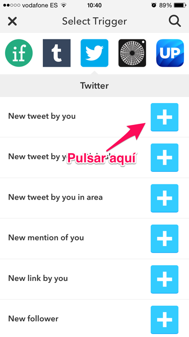 Ahora nos aparece la famosa frase «If + than +». Pulsamos sobre el primer símbolo + y buscamos entre todas las aplicaciones de arriba, la app de Twitter. Cuando la hayamos encontrado, pulsamos sobre la primera opción que nos aparece «New tweet by you».