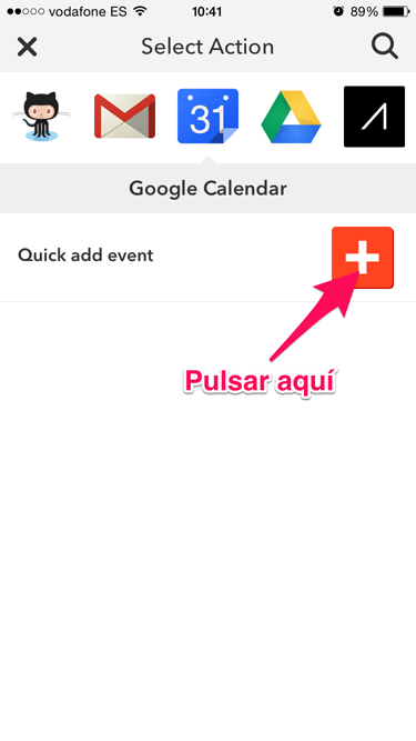 Tendremos que darle permisos para utilizar nuestra cuenta de Twitter. Hecho esto, vamos con el siguiente símbolo +. Pulsamos sobre el y en este caso buscamos la app «Google Calendar» y seleccionamos la única opción que nos aparece.