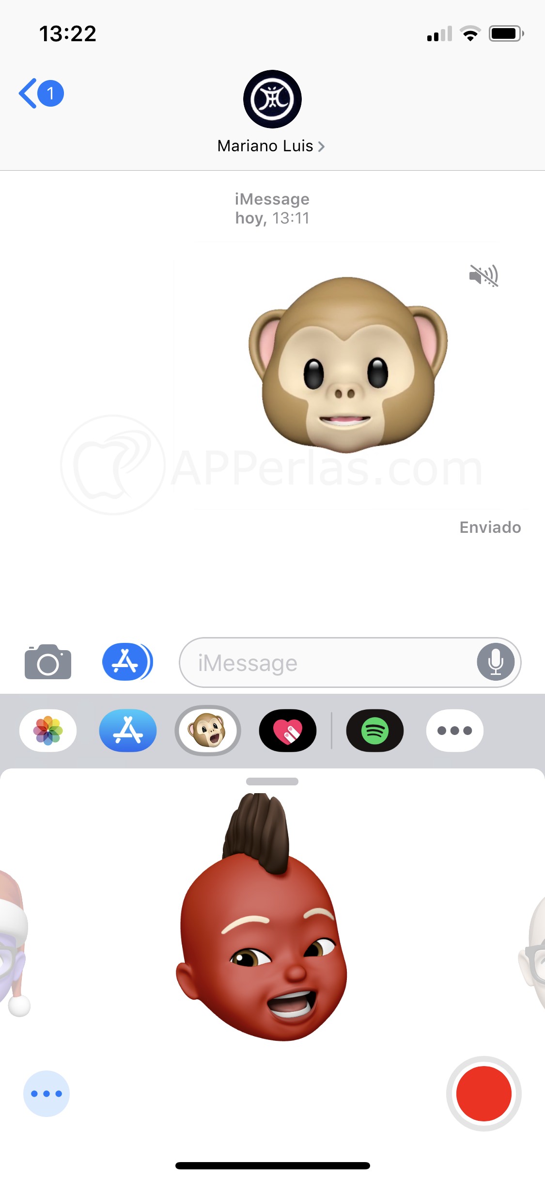 Una vez tengamos la conversación abierta, abrimos el apartado de los animojis. Estos se encuentran en la parte de abajo con el icono del mono. Accederemos a ellos y deberemos elegir el animoji o memoji que vayamos a usar. Esto lo haremos desplazándolos de de izquierda a derecha, o viceversa, o deslizando hacia arriba la pestañita que nos aparece sobre el animoji activo en ese momento.