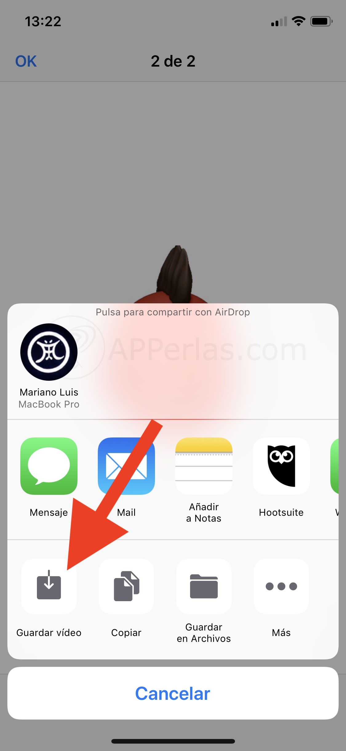 Grabamos el mensaje que queramos compartir y nos lo enviamos a nosotros mismos. Cuando esté enviado, pulsamos sobre el memoji o animoji que hemos enviado. Nos aparecerá en la parte de abajo el botón de compartir.