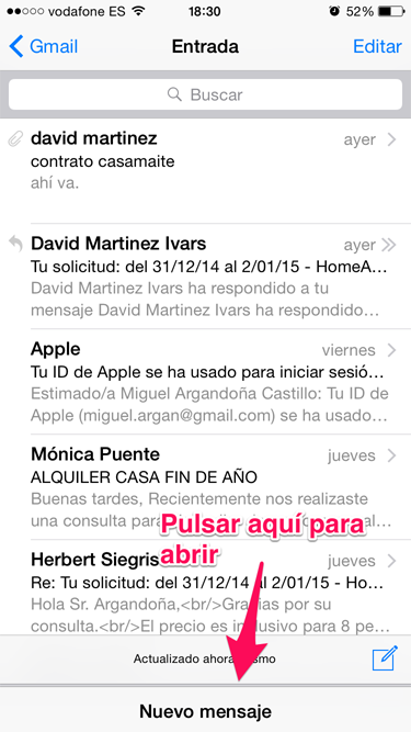 Pero sin duda una de las novedades que al equipo de APPerlas ha llamado la atención es la de poder estar escribiendo un mail y sin necesidad de cerrarlo, tan solo dejándolo en segundo plano, podemos seguir leyendo todo nuestro correo. Fantástico, ¿verdad?.