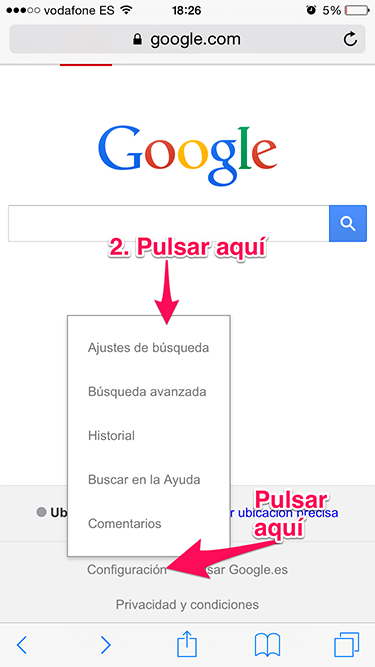 En primer lugar, debemos acceder a Safari y entrar en Google. Desde aquí, nos desplazamos a la parte de abajo del buscador, donde encontramos la configuración. Desde aquí, podremos configurar cualquier aspecto, como por ejemplo la ubicación.