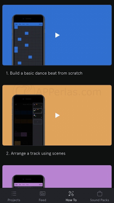 Dentro de la app, tenemos disponible una serie de tutoriales con los que aprenderemos a usar el editor musical. Pulsando en la flecha que nos aparece en la parte superior derecha de la pantalla, accedemos a un menú. Miramos en el menú inferior y allí nos parece la opción «HOW TO«. Ese es el lugar donde están los tutoriales.