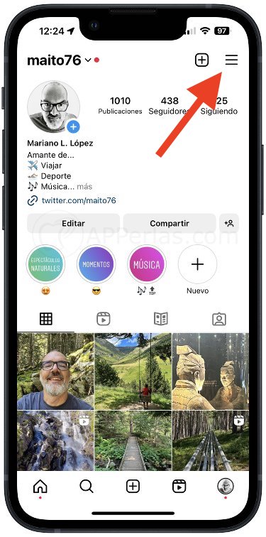 Para ello, nos vamos a la app. Una vez aquí debemos acceder a nuestro perfil, pulsando en el botón de la derecha que aparece en el menú inferior de la pantalla. Ahora pulsaremos sobre la pestaña que se encuentra en la parte derecha de arriba de nuestra pantalla, el famoso icono de las tres rayas horizontales.