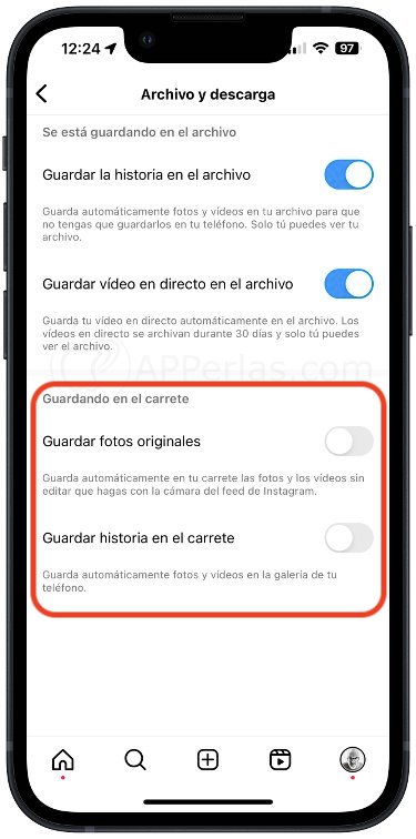 Al desactivarla, cuando subamos una foto o historia, esta no se guardará en el carrete.