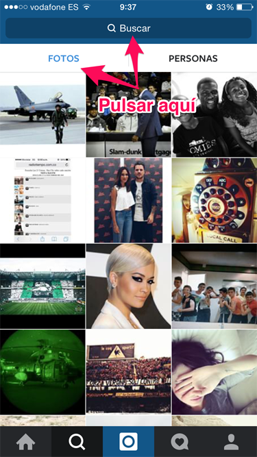 Lo primero que debemos hacer es entrar en la app Instagram y dirigirnos al buscador, desde el cual podemos buscar usuarios, lugares…Para quien no sepa donde se encuentra este apartado, es el icono de la lupa, que está justo en la parte de abajo.