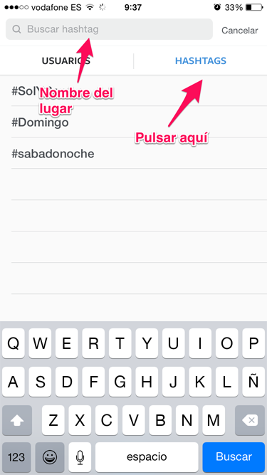 Nos aparecen de nuevo dos opciones (usuarios o hashtags). En este caso seleccionamos la opción «Hashtags», y pulsamos de nuevo sobre el buscador. Lo que tenemos que hacer ahora es poner el nombre de la ciudad, monumento, estadio… en el que hemos estado recientemente.