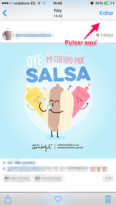 Cuando tengamos realizada la captura de pantalla, podremos salir de Instagram y nos dirigimos a la app nativa de fotos, donde encontraremos la imagen que hemos capturado. Para hacernos con la imagen y desechar todo lo demás, pulsamos sobre ella y seguidamente el botón «Editar».