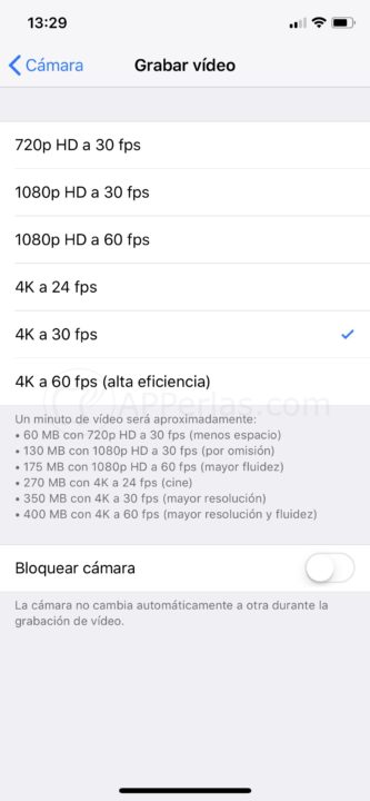 De entre ellas elegimos cualquiera de las de 4K. Decir de ellas que a cuanto más fts, más calidad. Nosotros recomendamos elegir la de 30 fts (fotogramas por segundo), aunque si tienes un iPhone de mucha capacidad de almacenamiento, sin dudarlo, activaríamos la de 60 fts. Pulsada la opción indicada, cada vez que vayamos a grabar lo estaremos haciendo en 4K.