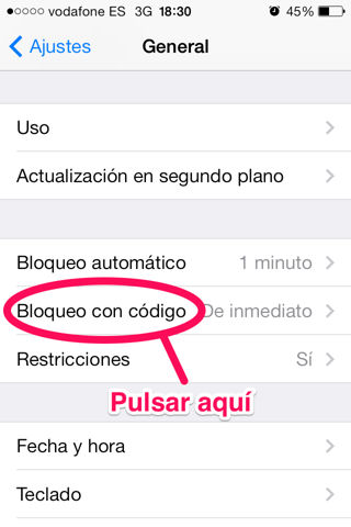 Ahora que ya estamos dentro de «General«, buscamos la pestaña que pone «Bloqueo con código» y pulsamos sobre ella.