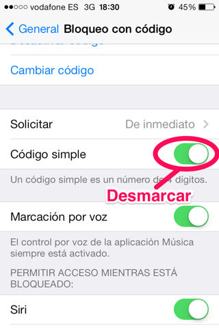 Una vez la hemos desmarcado, nos pedira que pongamos nuestro código de desbloqueo (en el caso de que tengamos uno) o directamente que pongamos el código nuevo (este nuevo código puede ser de más de 4 dígitos).