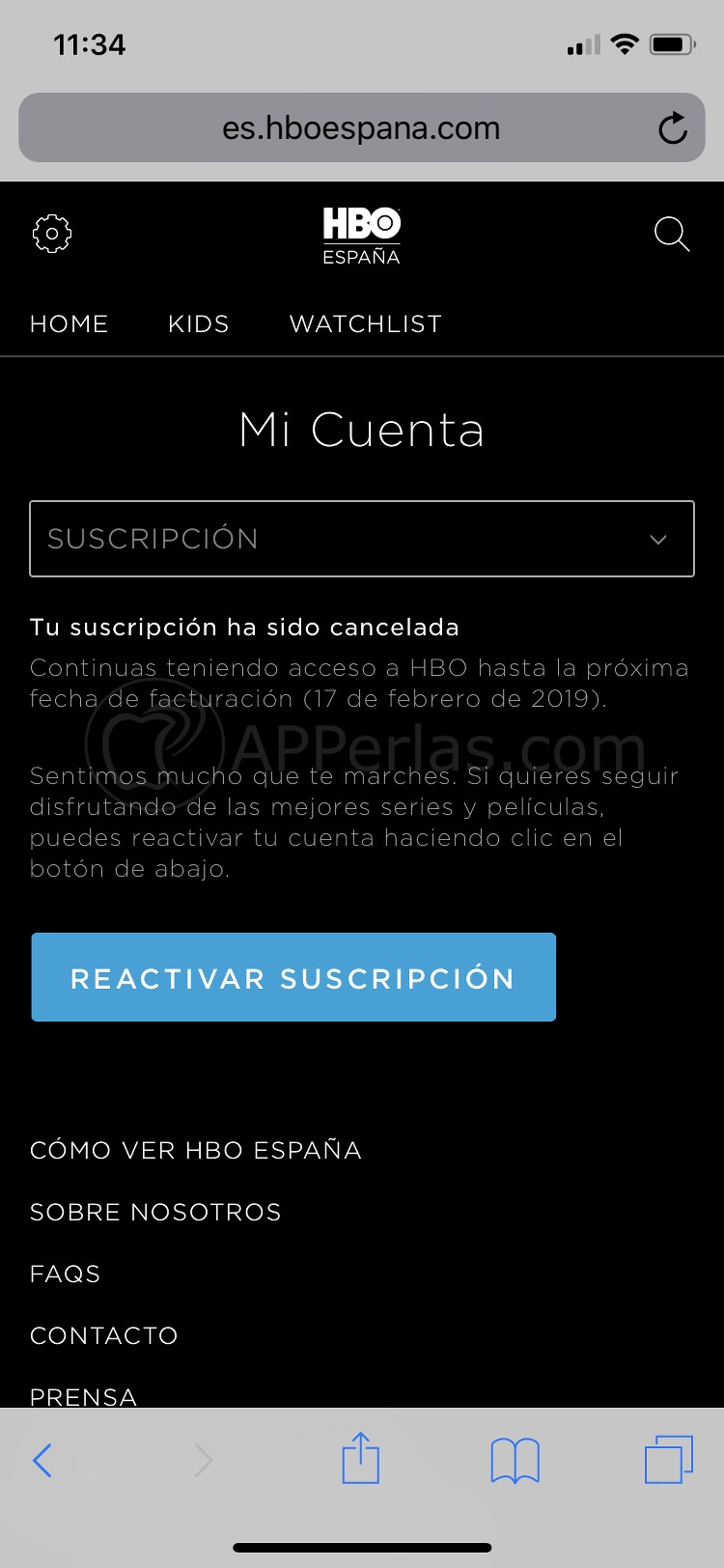 Pulsamos en esa opción y nos volverá a aparecer una pantalla avisando de que aun podemos seguir suscritos. Nosotros, evidentemente, pulsamos en «Cancelar Suscripción». De esta manera hemos cancelado nuestra suscripción gratuita a HBO en iPhone. Por lo tanto, pasado este mes ya no tendremos que pagar absolutamente nada. Cómo veis en la siguiente imagen, hemos cancelado la suscripción pero podemos seguir disfrutando del periodo gratuito.