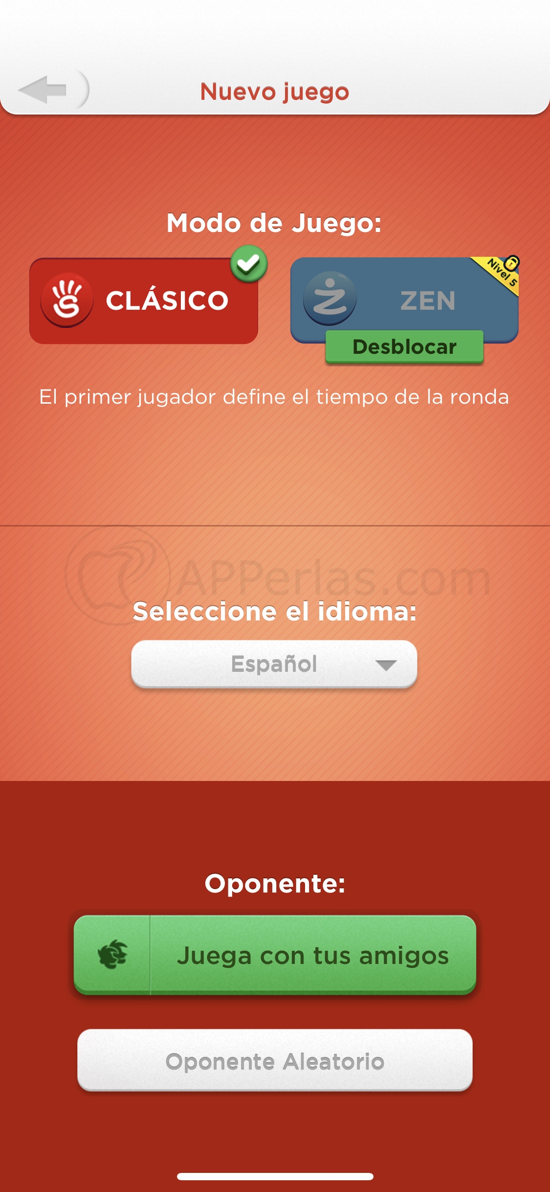 Comenzamos partida pulsando el botón «NUEVO JUEGO» ( situado en la pantalla principal), donde deberemos elegir si queremos jugar contra algún amigo de FACEBOOK o un oponente ALEATORIO. También podremos elegir el idioma en el que queremos jugar.