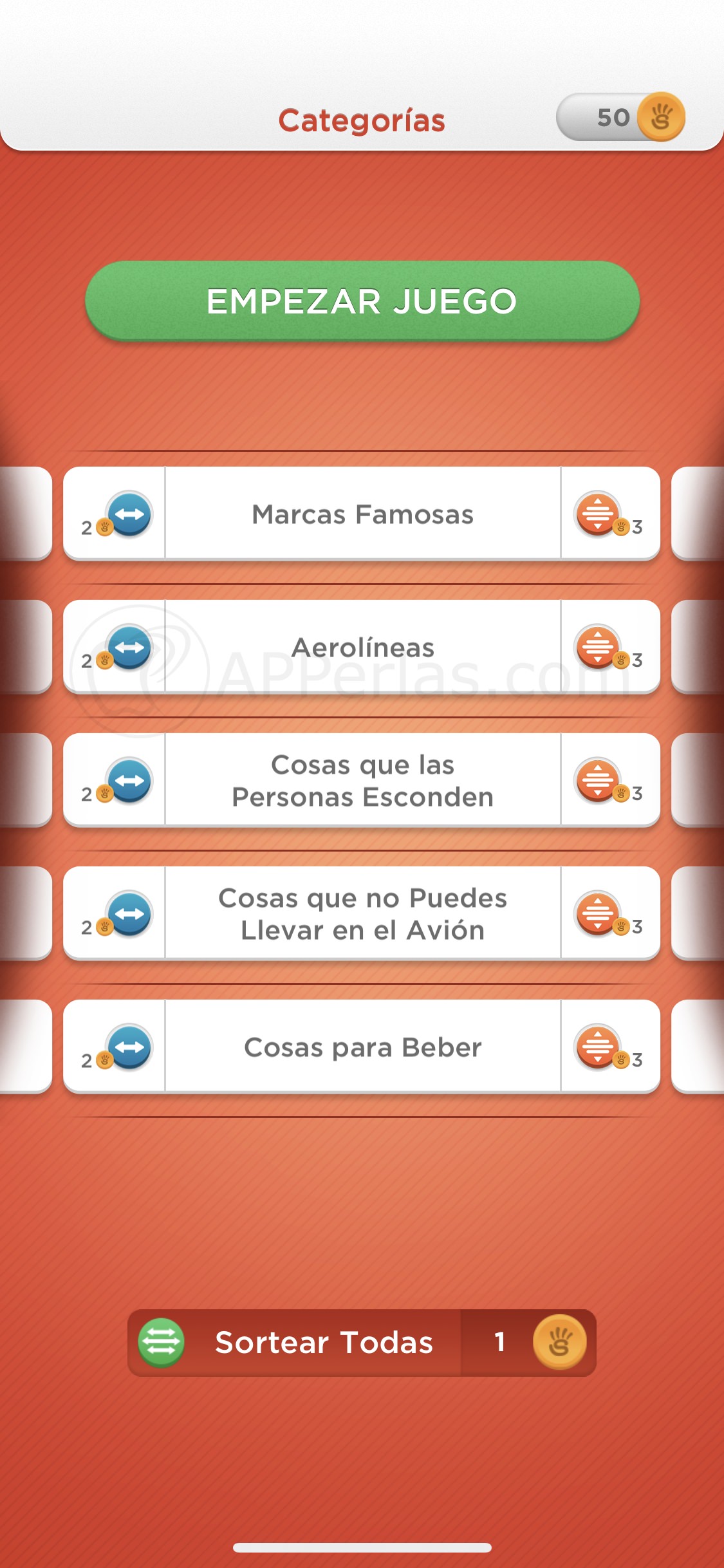 Tras esto deberemos elegir las 5 categorías con las que queremos jugar. Normalmente elegiremos las que mejor se nos den (muchas veces comenzaremos partidas empezadas por otra persona y no podremos elegir categorías hasta pasadas una ronda). Tras la elección pulsaremos «EMPEZAR PARTIDA«.