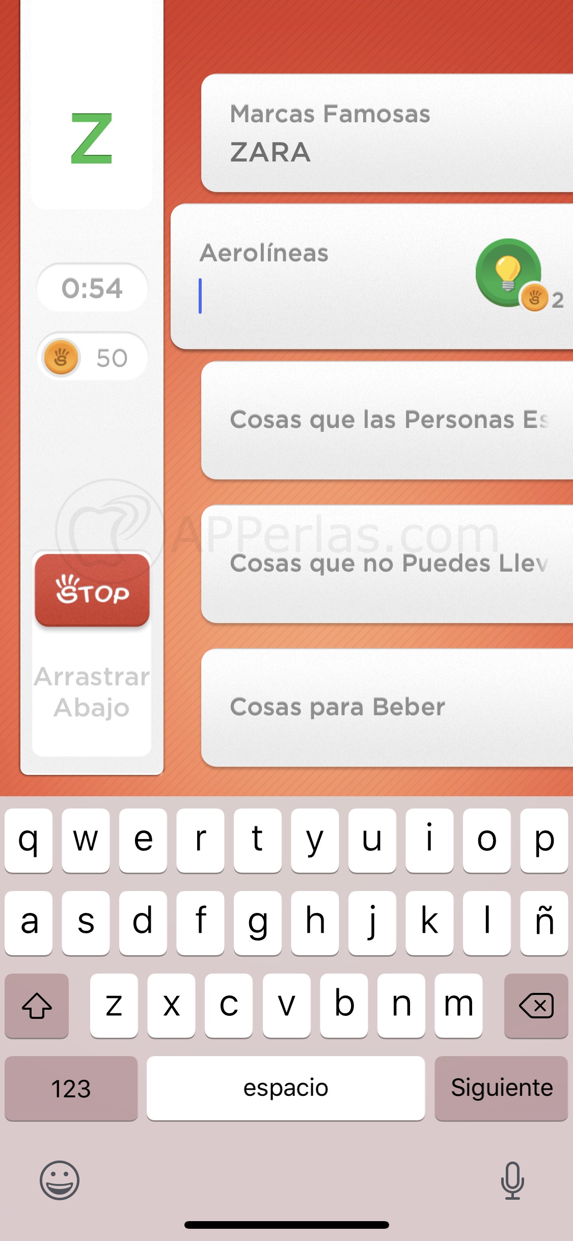Comenzaremos a jugar y deberemos poner las palabras que empiecen por la letra que haya salido, en cada una de las categorías. Cuanto más rápido lo hagamos, mejor. Una vez que un jugador pulse en Stop, hará que el otro oponente no pueda seguir montando palabras. Es por eso que debes ser muy rápido.
