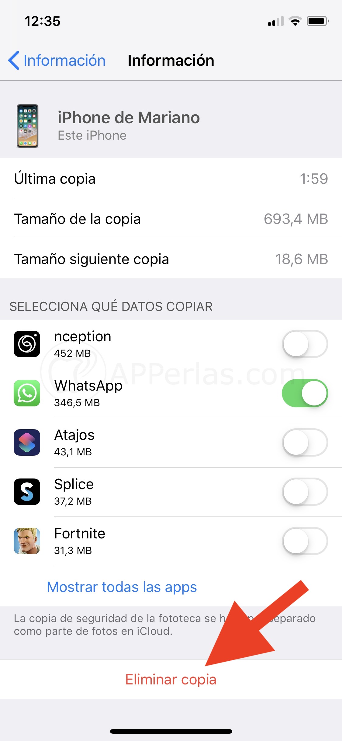 Cómo lo que queremos es eliminarlas para liberar espacio en iCloud, tan solo debemos desplazarnos hasta la parte de abajo de este menú y encontraremos una pestaña con el nombre de «Eliminar copia».