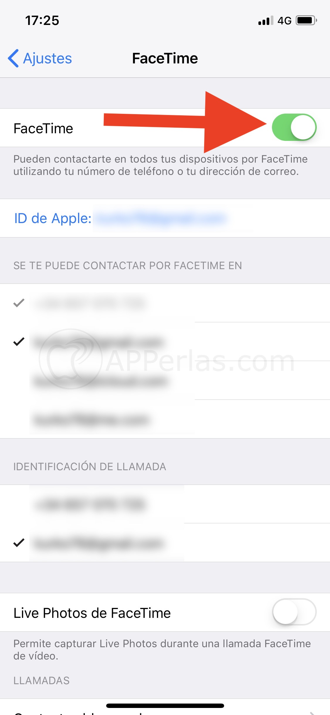Antes de nada tenemos que tener activa la función FACETIME. Esto se ve en la siguiente ruta… AJUSTES/FACETIME.