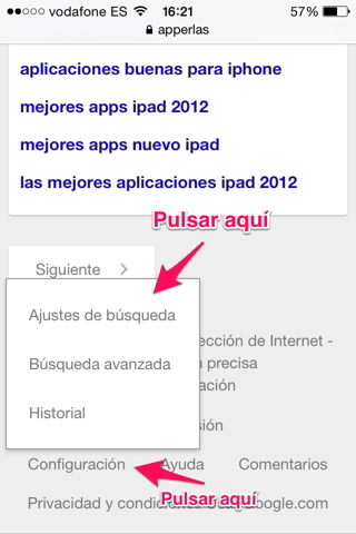Justo debajo de la ubicación, nos aparece «Configuración», debemos pulsar aquí y nos aparecerá un pequeño menú, con una pestaña que pone «Ajustes de búsqueda», pulsamos sobre esta opción.
