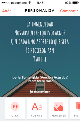 Si esta mañana habéis leído nuestra noticia sobre la nueva actualización de MusixMatch, seguro que os habréis dado cuenta de que la versión 5.1 de esta APPerla, viene con la nueva función LYRICSCARD, una manera de compartir frases, de tus canciones favoritas, de una manera sencilla, agradable a la vista y con mucho encanto.