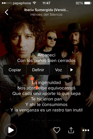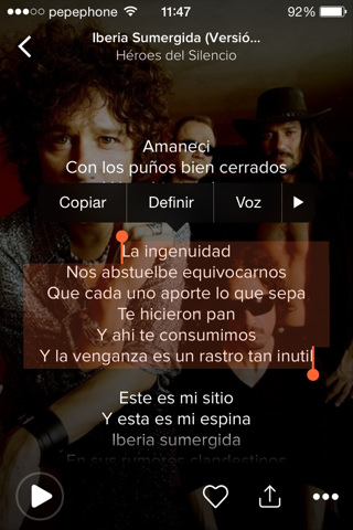 Una vez tengamos la letra de la canción en pantalla, buscaremos la frase que queramos convertir en LyricsCard. Encontrada la misma, mantendremos pulsada la primera palabra de la frase hasta que nos aparezca como seleccionada y con unas opciones en la parte superior.