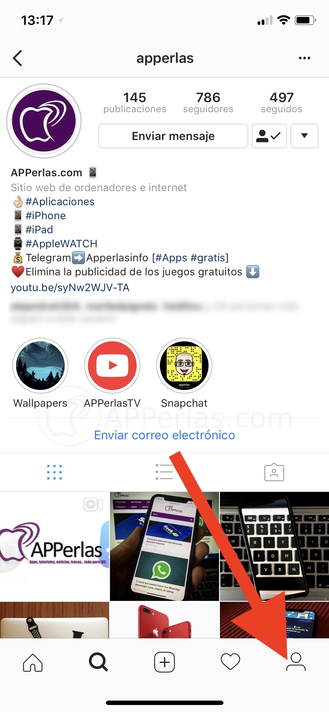 Lo primero que tenemos que hacer es ir a nuestra bio de instagram para cambiarla. Para ello pulsamos en el botón del menú inferior caracterizado con una silueta. Es el que está más a la derecha.
