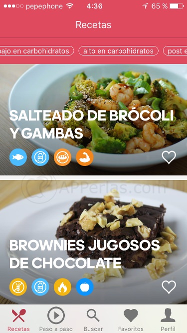 Las categorías las podéis ver en la parte superior de la cuidad interfaz de la app. Estas nos permitirán acceder rápidamente a las recetas vegetarianas, recetas de postres fáciles, recetas protéicas, etc… . Desplazando el dedo de izquierda a derecha, o viceversa, sobre esa zona, podremos ver todas las categorías disponibles.