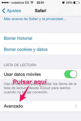 Dentro de esta pestaña, tenemos varias opciones, como la de borrar el historial de navegación de nuestro iPhone, iPad o iPod Touch. Pero en este caso, nos interesa que Safari vaya más rápido y evidentemente más fluido. Por lo que debemos irnos a los ajustes avanzados que se encuentran justamente en la última pestaña.