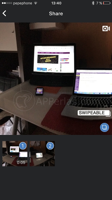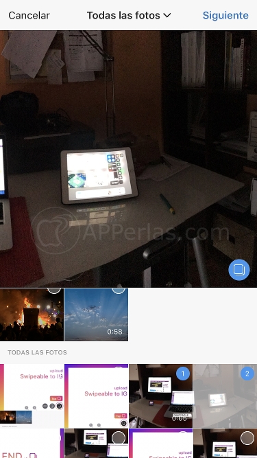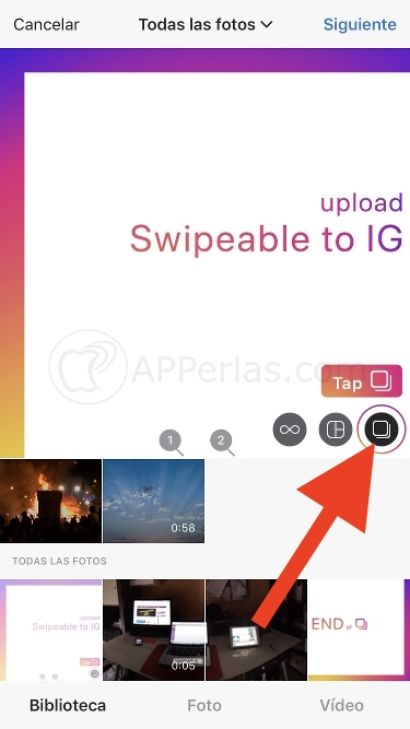 Pulsamos en el icono de los dos recuadros superpuestos y seleccionamos las fotos del panorama que ha partido Swipeable. En nuestro caso son 2 fotos.