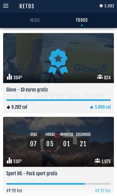 Periódicamente las marcas suben a la aplicación determinados retos a los que cada usuario puede apuntarse y poco a poco se van consiguiendo, o no, los diferentes retos según la intensidad del ejercicio.